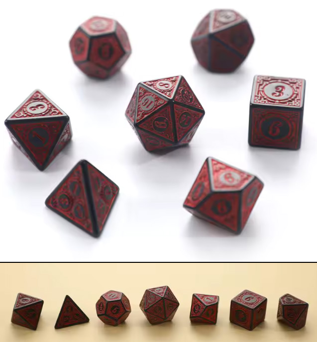 Sada sedmi různých hracích kostek. Černý základ a vzor v různobarevném provedení.